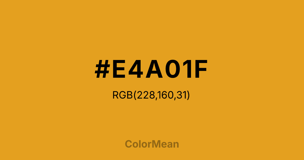 #E4A01F RGB value is (228, 160, 31). The hex color red value is 228, green is 160, and blue is 31. Its HSL format shows a hue of 39°, saturation of 78 percent, and lightness of 51 percent. The CMYK process values are 0 percent, 30 percent, 86 percent, 11 percent.