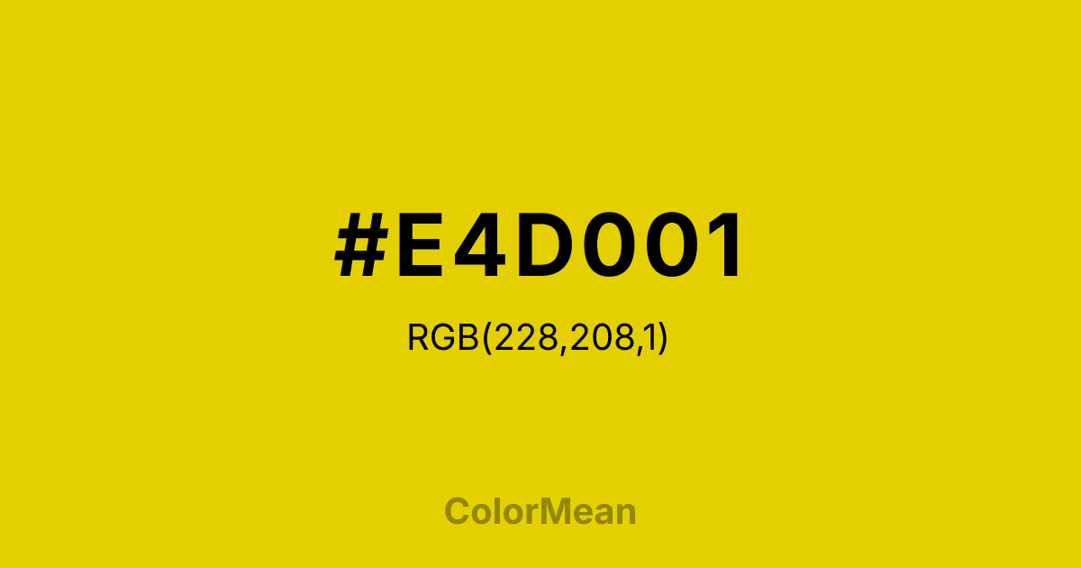 #E4D001 RGB value is (228, 208, 1). The hex color red value is 228, green is 208, and blue is 1. Its HSL format shows a hue of 55°, saturation of 99 percent, and lightness of 45 percent. The CMYK process values are 0 percent, 9 percent, 100 percent, 11 percent.