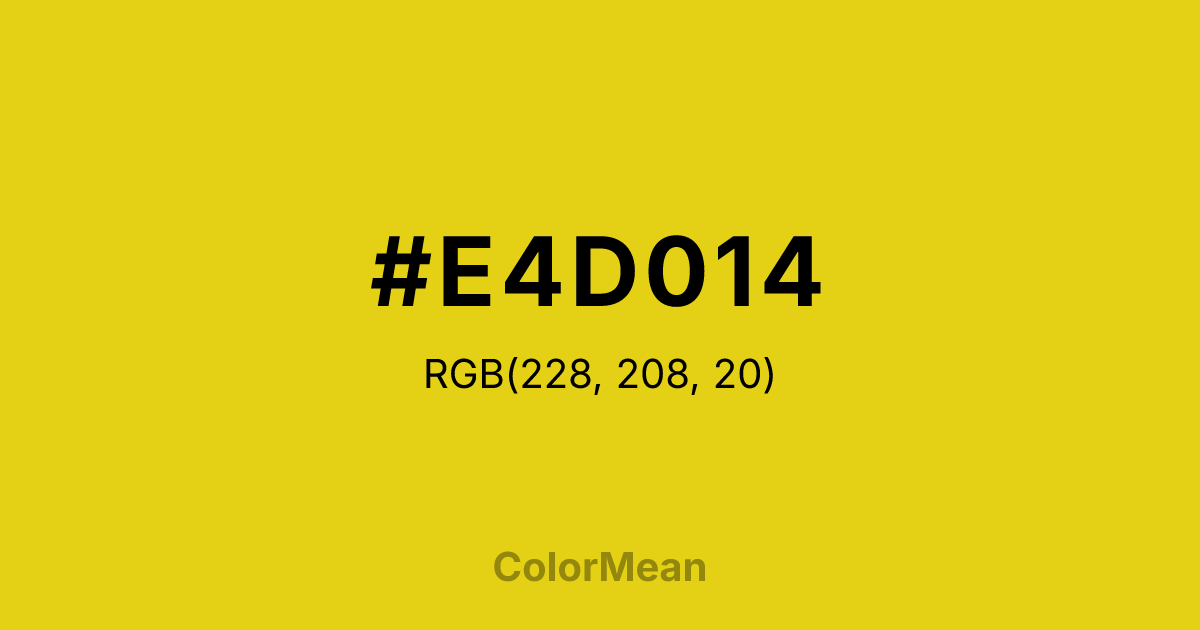 #E4D014 RGB value is (228, 208, 20). The hex color red value is 228, green is 208, and blue is 20. Its HSL format shows a hue of 54°, saturation of 84 percent, and lightness of 49 percent. The CMYK process values are 0 percent, 9 percent, 91 percent, 11 percent.