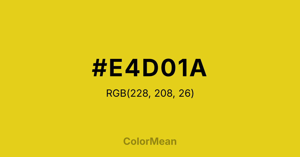 #E4D01A RGB value is (228, 208, 26). The hex color red value is 228, green is 208, and blue is 26. Its HSL format shows a hue of 54°, saturation of 80 percent, and lightness of 50 percent. The CMYK process values are 0 percent, 9 percent, 89 percent, 11 percent.