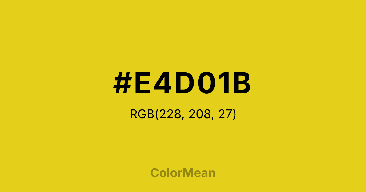 #E4D01B RGB value is (228, 208, 27). The hex color red value is 228, green is 208, and blue is 27. Its HSL format shows a hue of 54°, saturation of 79 percent, and lightness of 50 percent. The CMYK process values are 0 percent, 9 percent, 88 percent, 11 percent.