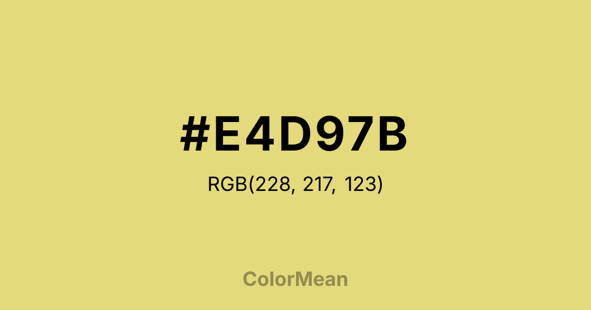 #E4D97B RGB value is (228, 217, 123). The hex color red value is 228, green is 217, and blue is 123. Its HSL format shows a hue of 54°, saturation of 66 percent, and lightness of 69 percent. The CMYK process values are 0 percent, 5 percent, 46 percent, 11 percent.