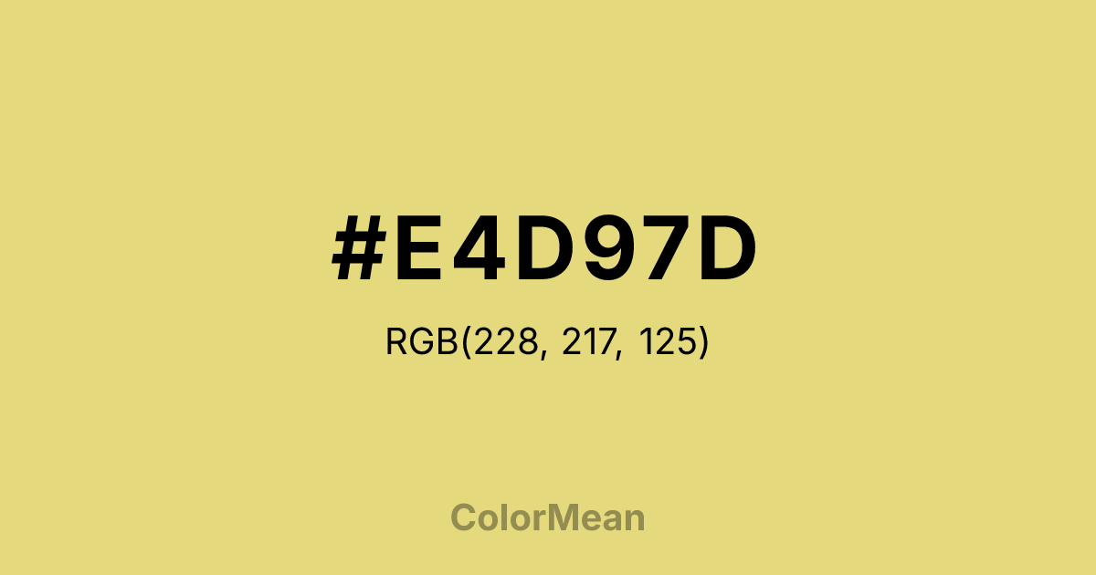 #E4D97D RGB value is (228, 217, 125). The hex color red value is 228, green is 217, and blue is 125. Its HSL format shows a hue of 54°, saturation of 66 percent, and lightness of 69 percent. The CMYK process values are 0 percent, 5 percent, 45 percent, 11 percent.