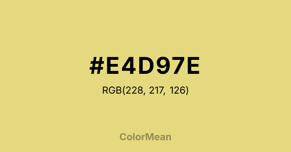 #E4D97E RGB value is (228, 217, 126). The hex color red value is 228, green is 217, and blue is 126. Its HSL format shows a hue of 54°, saturation of 65 percent, and lightness of 69 percent. The CMYK process values are 0 percent, 5 percent, 45 percent, 11 percent.