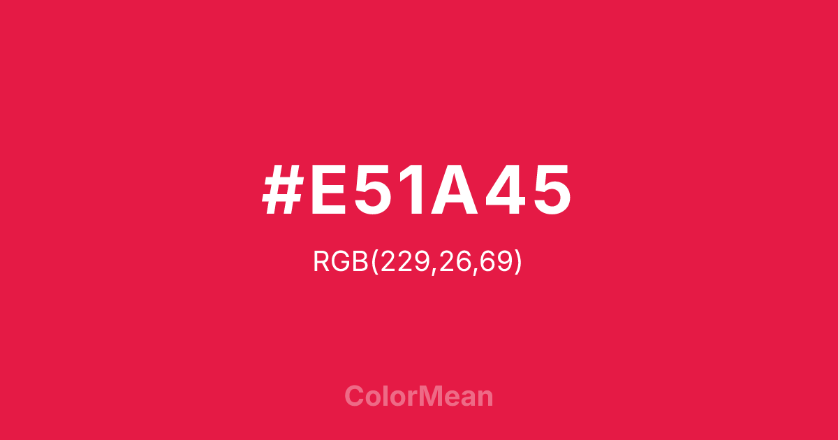 #E51A45 RGB value is (229, 26, 69). The hex color red value is 229, green is 26, and blue is 69. Its HSL format shows a hue of 347°, saturation of 80 percent, and lightness of 50 percent. The CMYK process values are 0 percent, 89 percent, 70 percent, 10 percent.