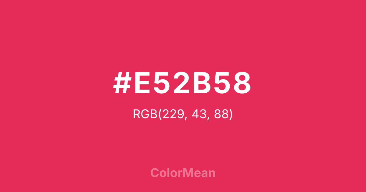 #E52B58 RGB value is (229, 43, 88). The hex color red value is 229, green is 43, and blue is 88. Its HSL format shows a hue of 345°, saturation of 78 percent, and lightness of 53 percent. The CMYK process values are 0 percent, 81 percent, 62 percent, 10 percent.