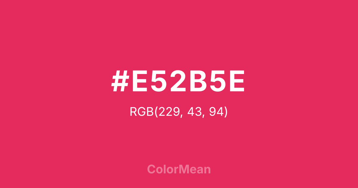 #E52B5E RGB value is (229, 43, 94). The hex color red value is 229, green is 43, and blue is 94. Its HSL format shows a hue of 344°, saturation of 78 percent, and lightness of 53 percent. The CMYK process values are 0 percent, 81 percent, 59 percent, 10 percent.