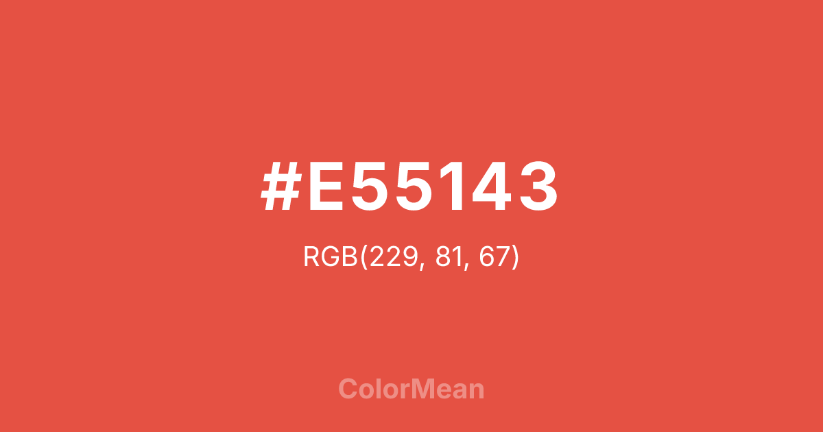 #E55143 RGB value is (229, 81, 67). The hex color red value is 229, green is 81, and blue is 67. Its HSL format shows a hue of 5°, saturation of 76 percent, and lightness of 58 percent. The CMYK process values are 0 percent, 65 percent, 71 percent, 10 percent.
