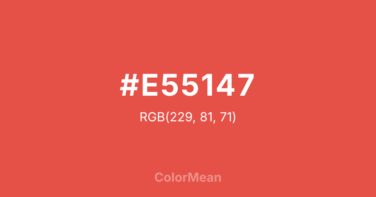 #E55147 RGB value is (229, 81, 71). The hex color red value is 229, green is 81, and blue is 71. Its HSL format shows a hue of 4°, saturation of 75 percent, and lightness of 59 percent. The CMYK process values are 0 percent, 65 percent, 69 percent, 10 percent.