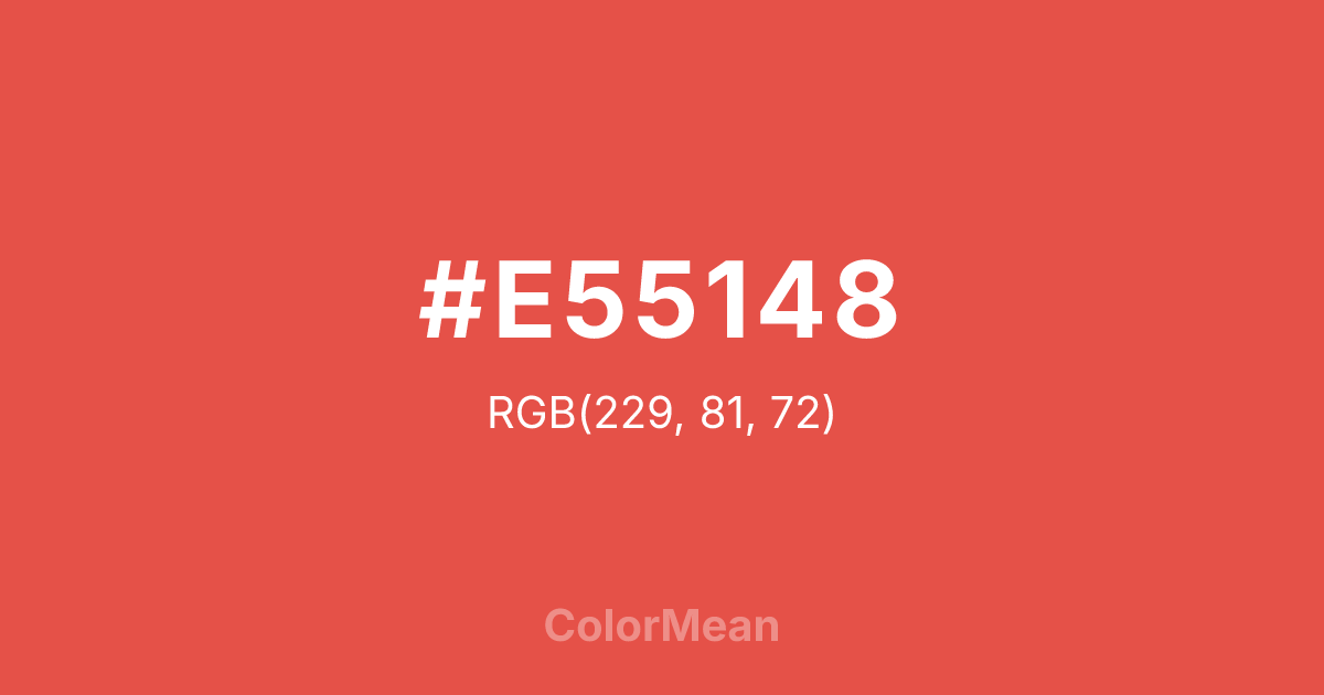 #E55148 RGB value is (229, 81, 72). The hex color red value is 229, green is 81, and blue is 72. Its HSL format shows a hue of 3°, saturation of 75 percent, and lightness of 59 percent. The CMYK process values are 0 percent, 65 percent, 69 percent, 10 percent.