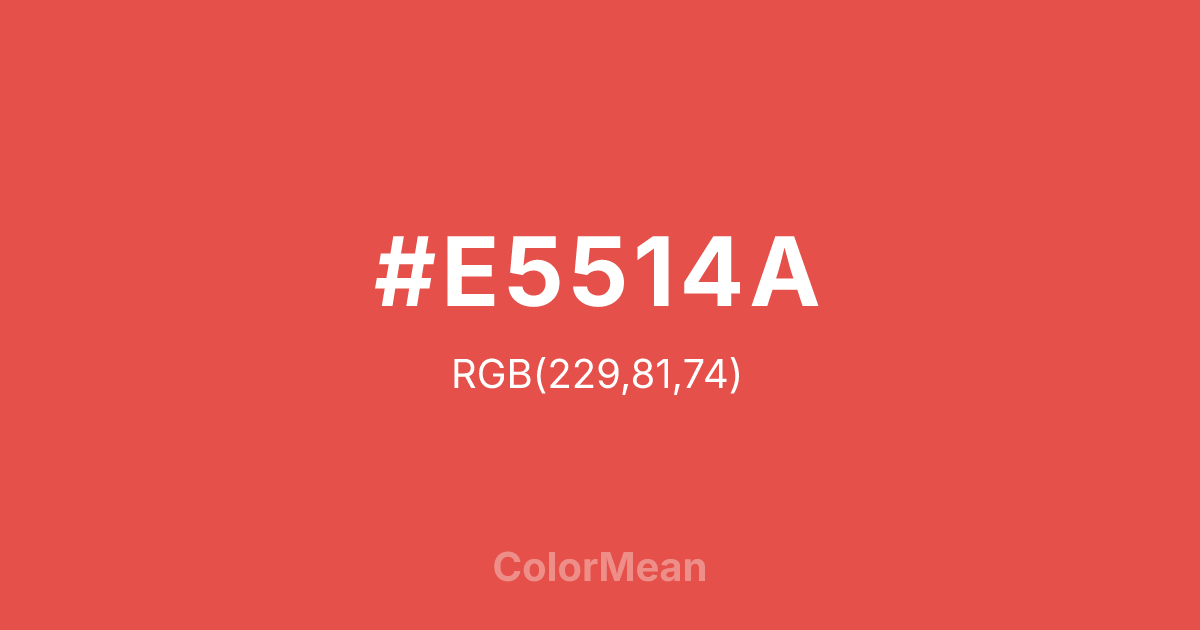 #E5514A RGB value is (229, 81, 74). The hex color red value is 229, green is 81, and blue is 74. Its HSL format shows a hue of 3°, saturation of 75 percent, and lightness of 59 percent. The CMYK process values are 0 percent, 65 percent, 68 percent, 10 percent.