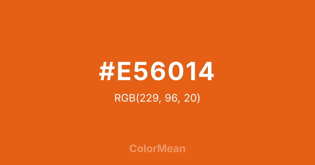 #E56014 RGB value is (229, 96, 20). The hex color red value is 229, green is 96, and blue is 20. Its HSL format shows a hue of 22°, saturation of 84 percent, and lightness of 49 percent. The CMYK process values are 0 percent, 58 percent, 91 percent, 10 percent.