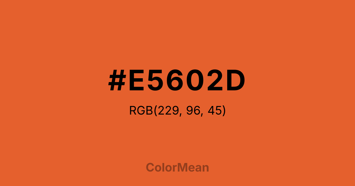 #E5602D RGB value is (229, 96, 45). The hex color red value is 229, green is 96, and blue is 45. Its HSL format shows a hue of 17°, saturation of 78 percent, and lightness of 54 percent. The CMYK process values are 0 percent, 58 percent, 80 percent, 10 percent.