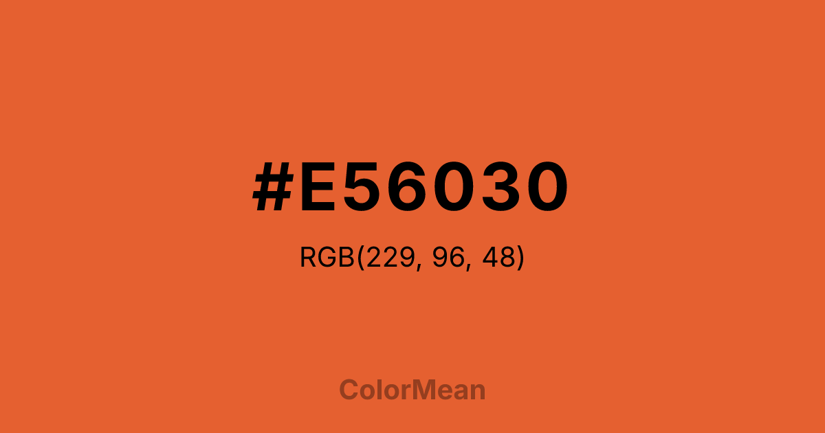 #E56030 RGB value is (229, 96, 48). The hex color red value is 229, green is 96, and blue is 48. Its HSL format shows a hue of 16°, saturation of 78 percent, and lightness of 54 percent. The CMYK process values are 0 percent, 58 percent, 79 percent, 10 percent.