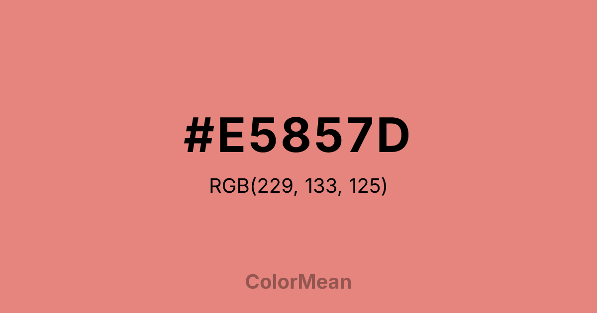 #E5857D RGB value is (229, 133, 125). The hex color red value is 229, green is 133, and blue is 125. Its HSL format shows a hue of 5°, saturation of 67 percent, and lightness of 69 percent. The CMYK process values are 0 percent, 42 percent, 45 percent, 10 percent.