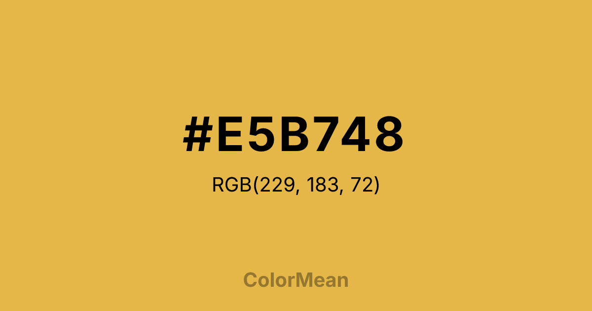 #E5B748 RGB value is (229, 183, 72). The hex color red value is 229, green is 183, and blue is 72. Its HSL format shows a hue of 42°, saturation of 75 percent, and lightness of 59 percent. The CMYK process values are 0 percent, 20 percent, 69 percent, 10 percent.