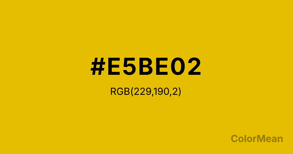 #E5BE02 RGB value is (229, 190, 2). The hex color red value is 229, green is 190, and blue is 2. Its HSL format shows a hue of 50°, saturation of 98 percent, and lightness of 45 percent. The CMYK process values are 0 percent, 17 percent, 99 percent, 10 percent.