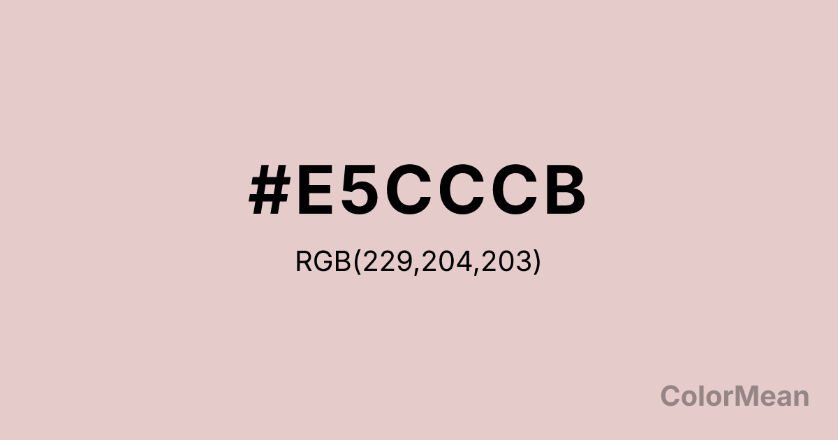 #E5CCCB RGB value is (229, 204, 203). The hex color red value is 229, green is 204, and blue is 203. Its HSL format shows a hue of 2°, saturation of 33 percent, and lightness of 85 percent. The CMYK process values are 0 percent, 11 percent, 11 percent, 10 percent.