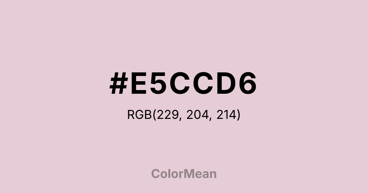 #E5CCD6 RGB value is (229, 204, 214). The hex color red value is 229, green is 204, and blue is 214. Its HSL format shows a hue of 336°, saturation of 32 percent, and lightness of 85 percent. The CMYK process values are 0 percent, 11 percent, 7 percent, 10 percent.