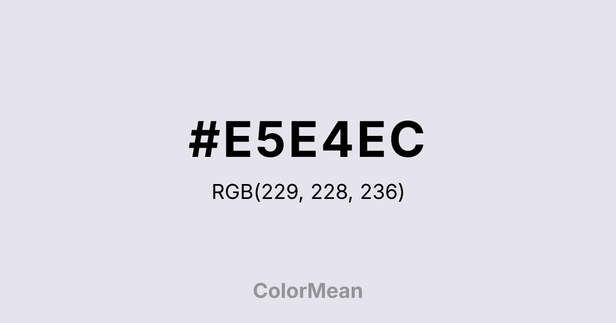 #E5E4EC RGB value is (229, 228, 236). The hex color red value is 229, green is 228, and blue is 236. Its HSL format shows a hue of 248°, saturation of 17 percent, and lightness of 91 percent. The CMYK process values are 3 percent, 3 percent, 0 percent, 7 percent.