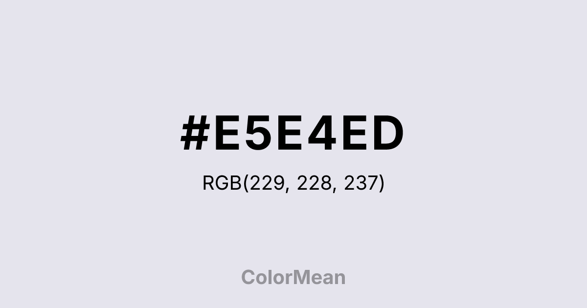 #E5E4ED RGB value is (229, 228, 237). The hex color red value is 229, green is 228, and blue is 237. Its HSL format shows a hue of 247°, saturation of 20 percent, and lightness of 91 percent. The CMYK process values are 3 percent, 4 percent, 0 percent, 7 percent.