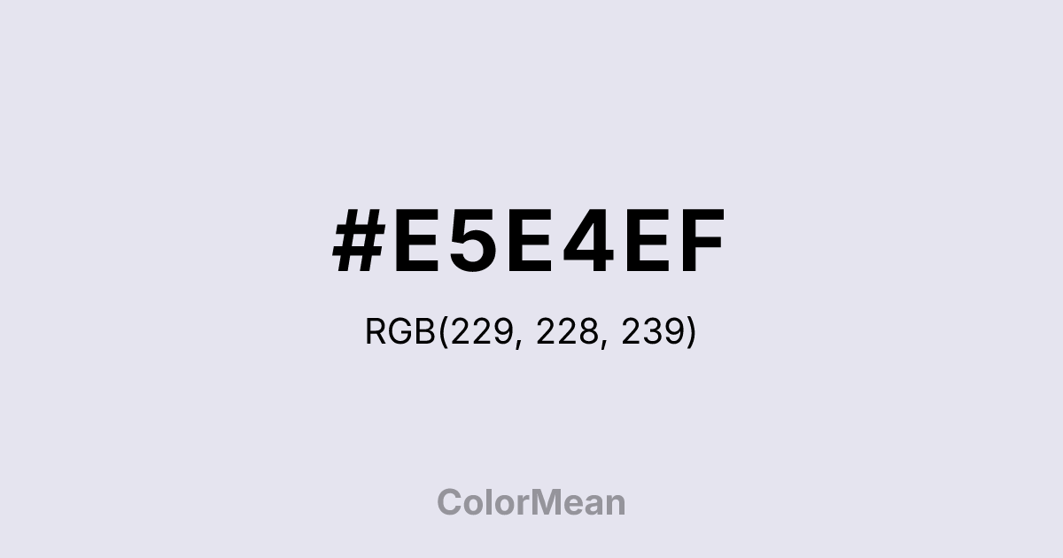 #E5E4EF RGB value is (229, 228, 239). The hex color red value is 229, green is 228, and blue is 239. Its HSL format shows a hue of 245°, saturation of 26 percent, and lightness of 92 percent. The CMYK process values are 4 percent, 5 percent, 0 percent, 6 percent.