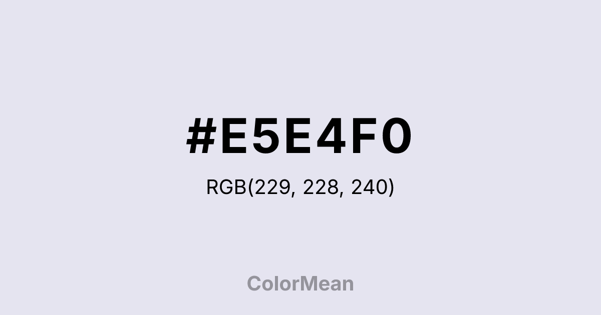 #E5E4F0 RGB value is (229, 228, 240). The hex color red value is 229, green is 228, and blue is 240. Its HSL format shows a hue of 245°, saturation of 29 percent, and lightness of 92 percent. The CMYK process values are 5 percent, 5 percent, 0 percent, 6 percent.