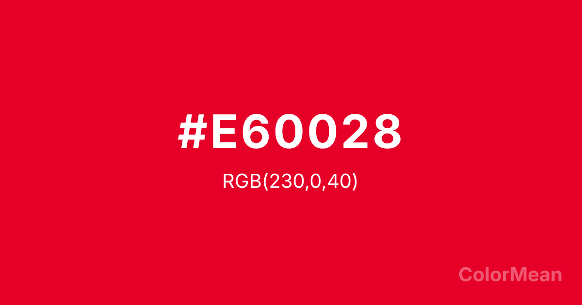 #E60028 RGB value is (230, 0, 40). The hex color red value is 230, green is 0, and blue is 40. Its HSL format shows a hue of 350°, saturation of 100 percent, and lightness of 45 percent. The CMYK process values are 0 percent, 100 percent, 83 percent, 10 percent.