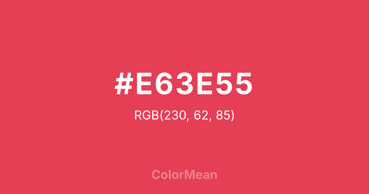 #E63E55 RGB value is (230, 62, 85). The hex color red value is 230, green is 62, and blue is 85. Its HSL format shows a hue of 352°, saturation of 77 percent, and lightness of 57 percent. The CMYK process values are 0 percent, 73 percent, 63 percent, 10 percent.