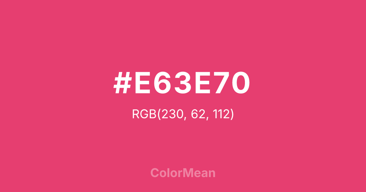 #E63E70 RGB value is (230, 62, 112). The hex color red value is 230, green is 62, and blue is 112. Its HSL format shows a hue of 342°, saturation of 77 percent, and lightness of 57 percent. The CMYK process values are 0 percent, 73 percent, 51 percent, 10 percent.
