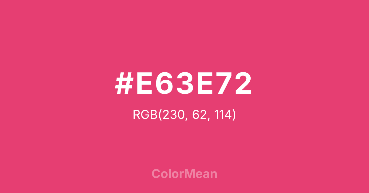 #E63E72 RGB value is (230, 62, 114). The hex color red value is 230, green is 62, and blue is 114. Its HSL format shows a hue of 341°, saturation of 77 percent, and lightness of 57 percent. The CMYK process values are 0 percent, 73 percent, 50 percent, 10 percent.