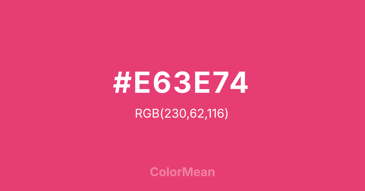 #E63E74 RGB value is (230, 62, 116). The hex color red value is 230, green is 62, and blue is 116. Its HSL format shows a hue of 341°, saturation of 77 percent, and lightness of 57 percent. The CMYK process values are 0 percent, 73 percent, 50 percent, 10 percent.