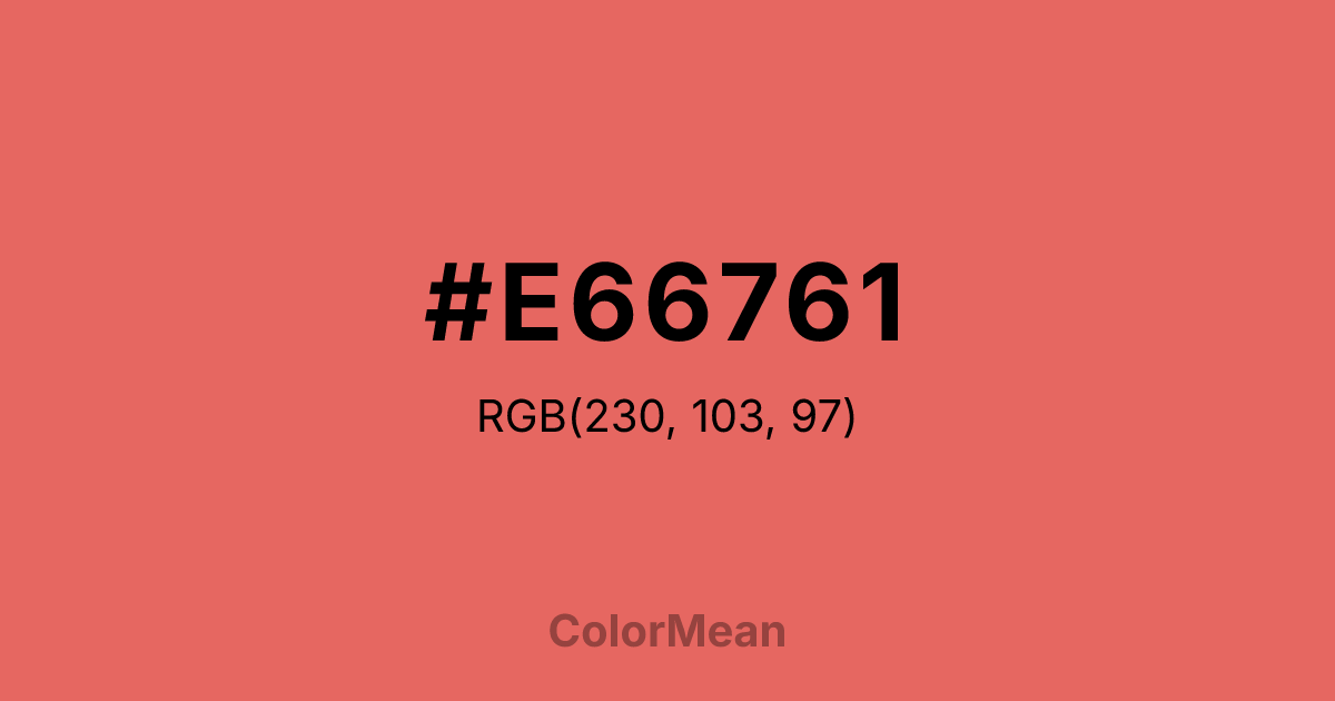 #E66761 RGB value is (230, 103, 97). The hex color red value is 230, green is 103, and blue is 97. Its HSL format shows a hue of 3°, saturation of 73 percent, and lightness of 64 percent. The CMYK process values are 0 percent, 55 percent, 58 percent, 10 percent.