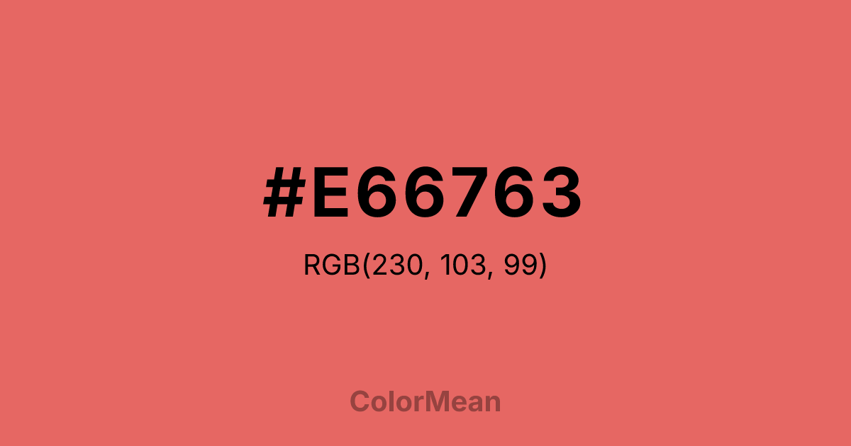 #E66763 RGB value is (230, 103, 99). The hex color red value is 230, green is 103, and blue is 99. Its HSL format shows a hue of 2°, saturation of 72 percent, and lightness of 65 percent. The CMYK process values are 0 percent, 55 percent, 57 percent, 10 percent.