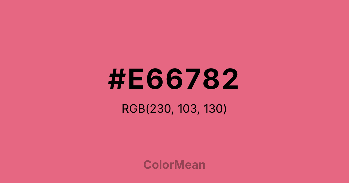 #E66782 RGB value is (230, 103, 130). The hex color red value is 230, green is 103, and blue is 130. Its HSL format shows a hue of 347°, saturation of 72 percent, and lightness of 65 percent. The CMYK process values are 0 percent, 55 percent, 43 percent, 10 percent.