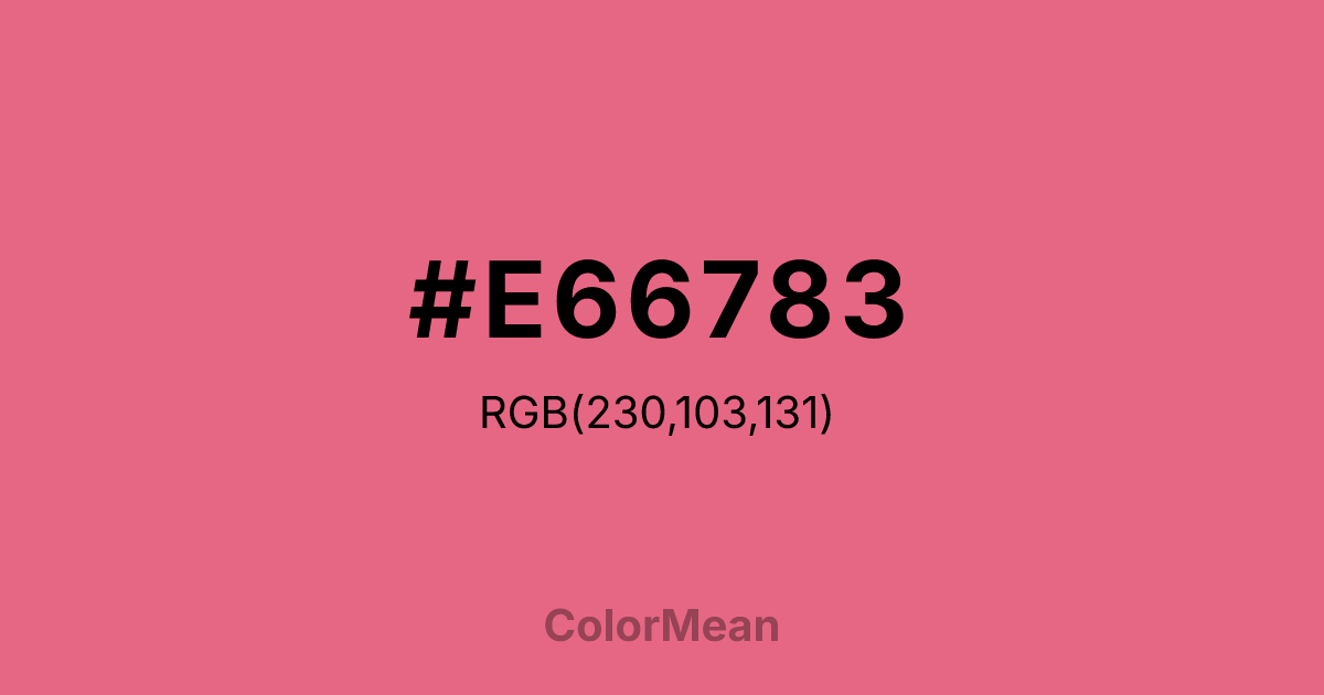 #E66783 RGB value is (230, 103, 131). The hex color red value is 230, green is 103, and blue is 131. Its HSL format shows a hue of 347°, saturation of 72 percent, and lightness of 65 percent. The CMYK process values are 0 percent, 55 percent, 43 percent, 10 percent.