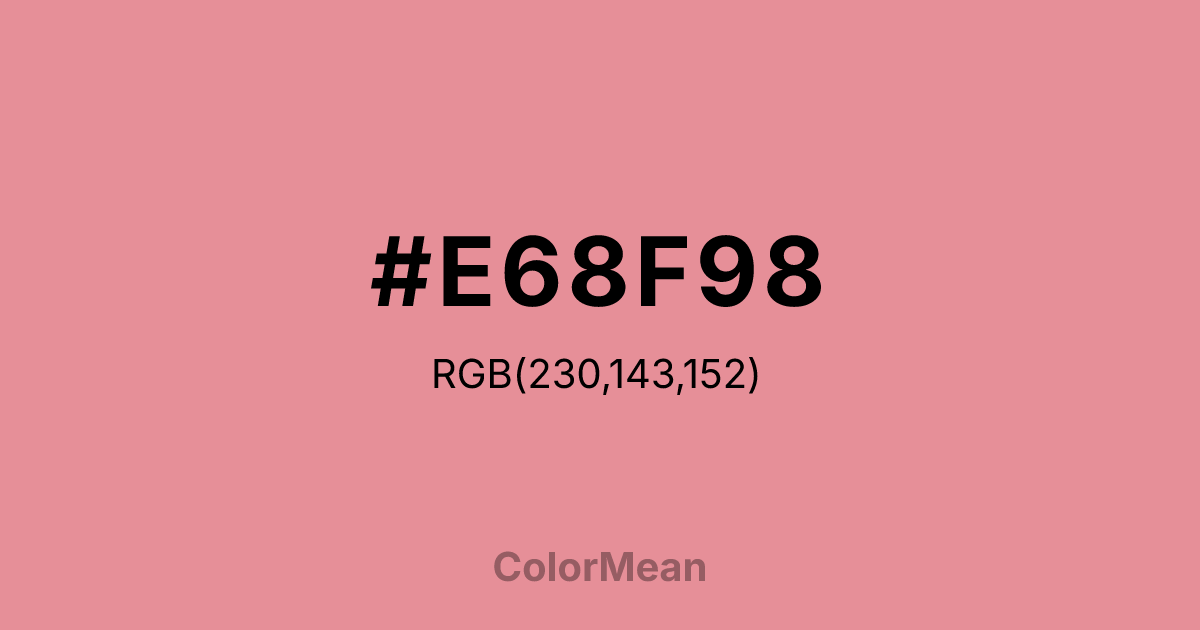 #E68F98 RGB value is (230, 143, 152). The hex color red value is 230, green is 143, and blue is 152. Its HSL format shows a hue of 354°, saturation of 64 percent, and lightness of 73 percent. The CMYK process values are 0 percent, 38 percent, 34 percent, 10 percent.
