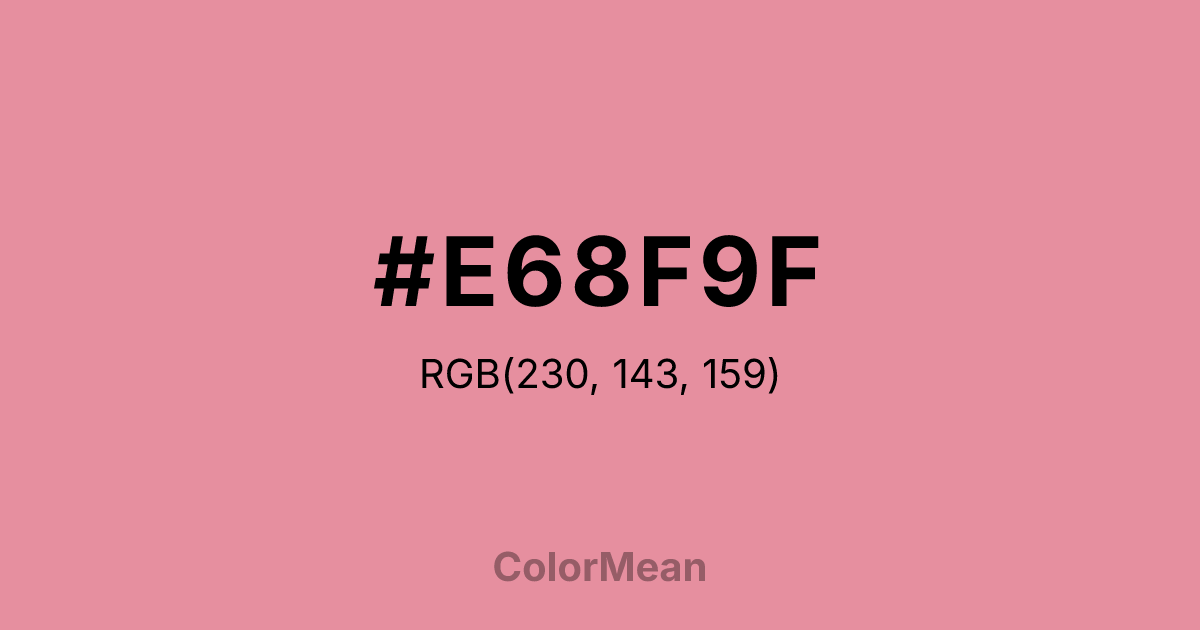 #E68F9F RGB value is (230, 143, 159). The hex color red value is 230, green is 143, and blue is 159. Its HSL format shows a hue of 349°, saturation of 64 percent, and lightness of 73 percent. The CMYK process values are 0 percent, 38 percent, 31 percent, 10 percent.