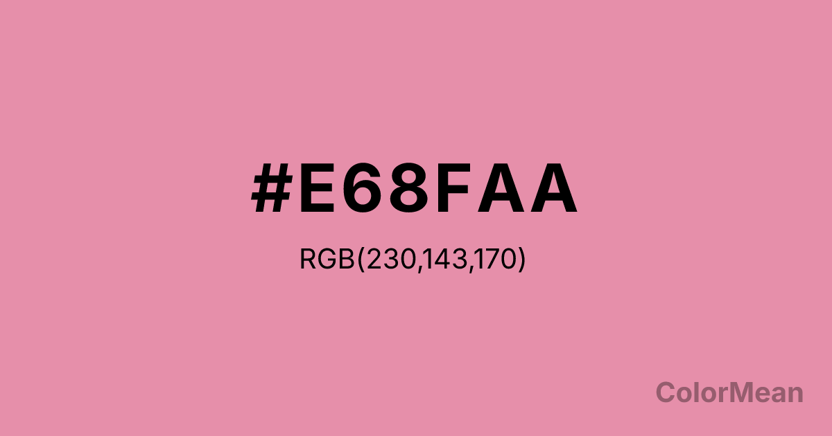 #E68FAA RGB value is (230, 143, 170). The hex color red value is 230, green is 143, and blue is 170. Its HSL format shows a hue of 341°, saturation of 64 percent, and lightness of 73 percent. The CMYK process values are 0 percent, 38 percent, 26 percent, 10 percent.