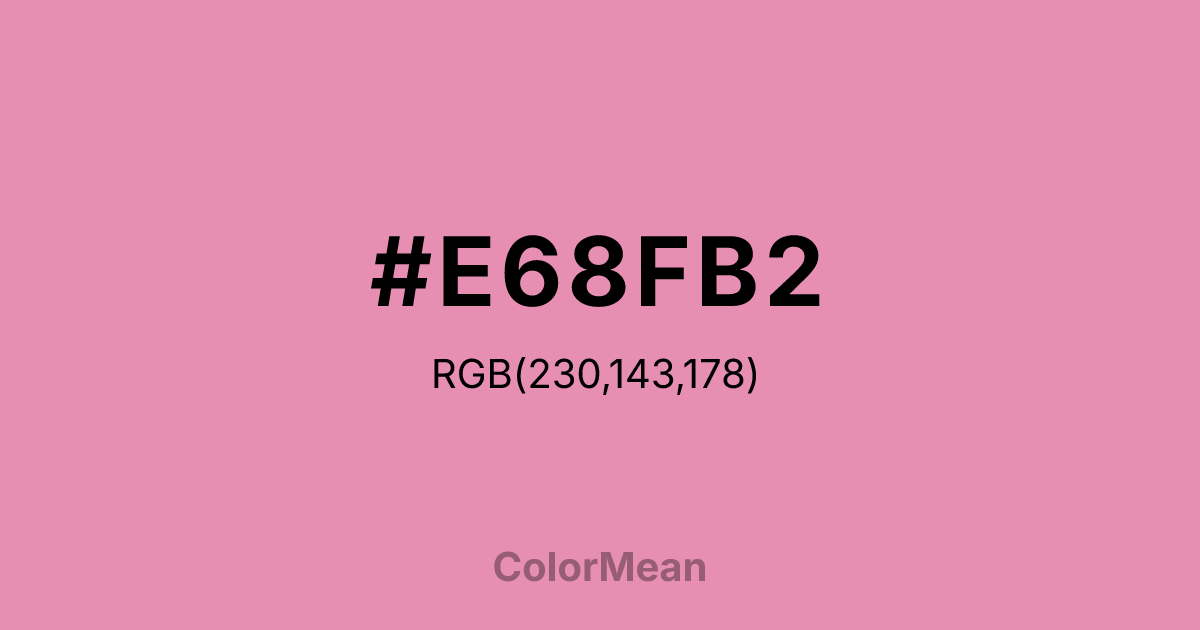 #E68FB2 RGB value is (230, 143, 178). The hex color red value is 230, green is 143, and blue is 178. Its HSL format shows a hue of 336°, saturation of 64 percent, and lightness of 73 percent. The CMYK process values are 0 percent, 38 percent, 23 percent, 10 percent.