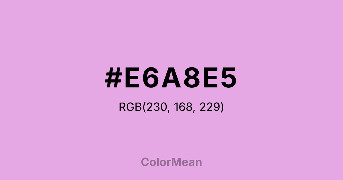 #E6A8E5 RGB value is (230, 168, 229). The hex color red value is 230, green is 168, and blue is 229. Its HSL format shows a hue of 301°, saturation of 55 percent, and lightness of 78 percent. The CMYK process values are 0 percent, 27 percent, 0 percent, 10 percent.