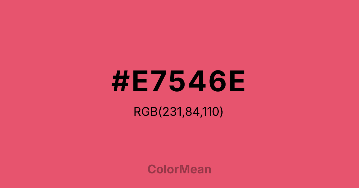 #E7546E RGB value is (231, 84, 110). The hex color red value is 231, green is 84, and blue is 110. Its HSL format shows a hue of 349°, saturation of 75 percent, and lightness of 62 percent. The CMYK process values are 0 percent, 64 percent, 52 percent, 9 percent.