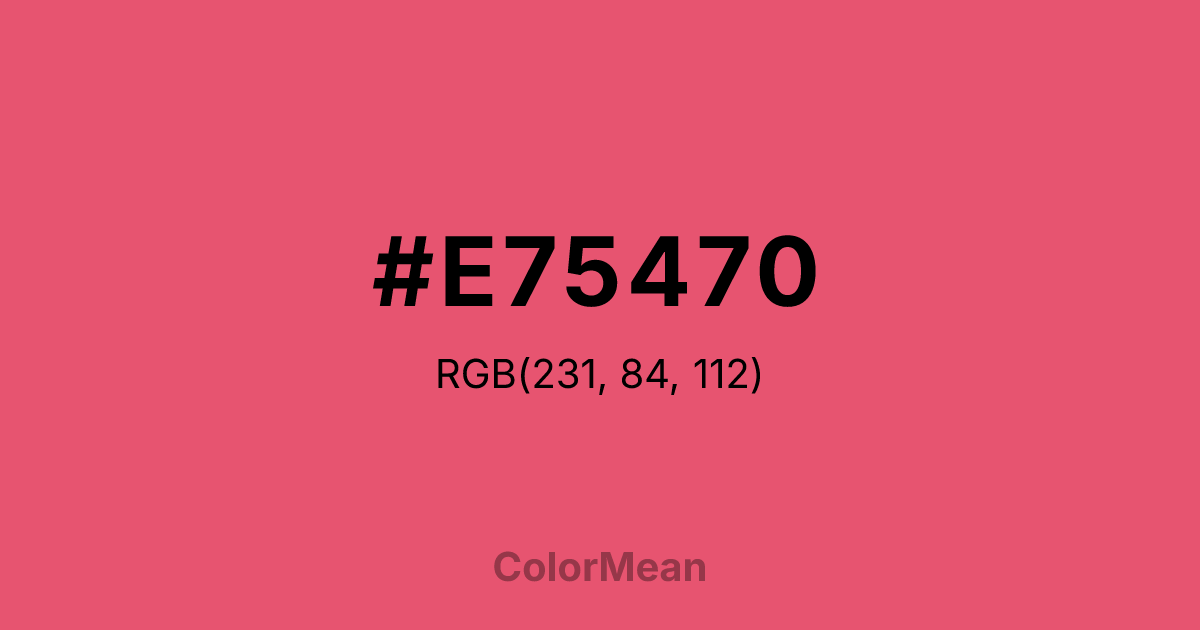 #E75470 RGB value is (231, 84, 112). The hex color red value is 231, green is 84, and blue is 112. Its HSL format shows a hue of 349°, saturation of 75 percent, and lightness of 62 percent. The CMYK process values are 0 percent, 64 percent, 52 percent, 9 percent.