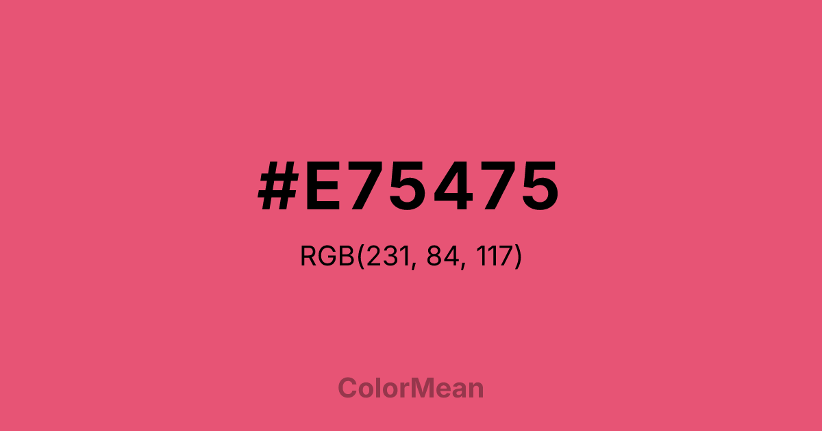 #E75475 RGB value is (231, 84, 117). The hex color red value is 231, green is 84, and blue is 117. Its HSL format shows a hue of 347°, saturation of 75 percent, and lightness of 62 percent. The CMYK process values are 0 percent, 64 percent, 49 percent, 9 percent.