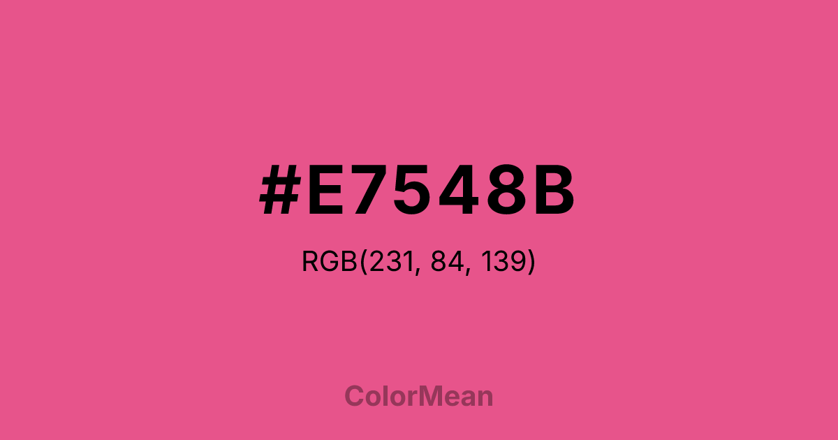 #E7548B RGB value is (231, 84, 139). The hex color red value is 231, green is 84, and blue is 139. Its HSL format shows a hue of 338°, saturation of 75 percent, and lightness of 62 percent. The CMYK process values are 0 percent, 64 percent, 40 percent, 9 percent.