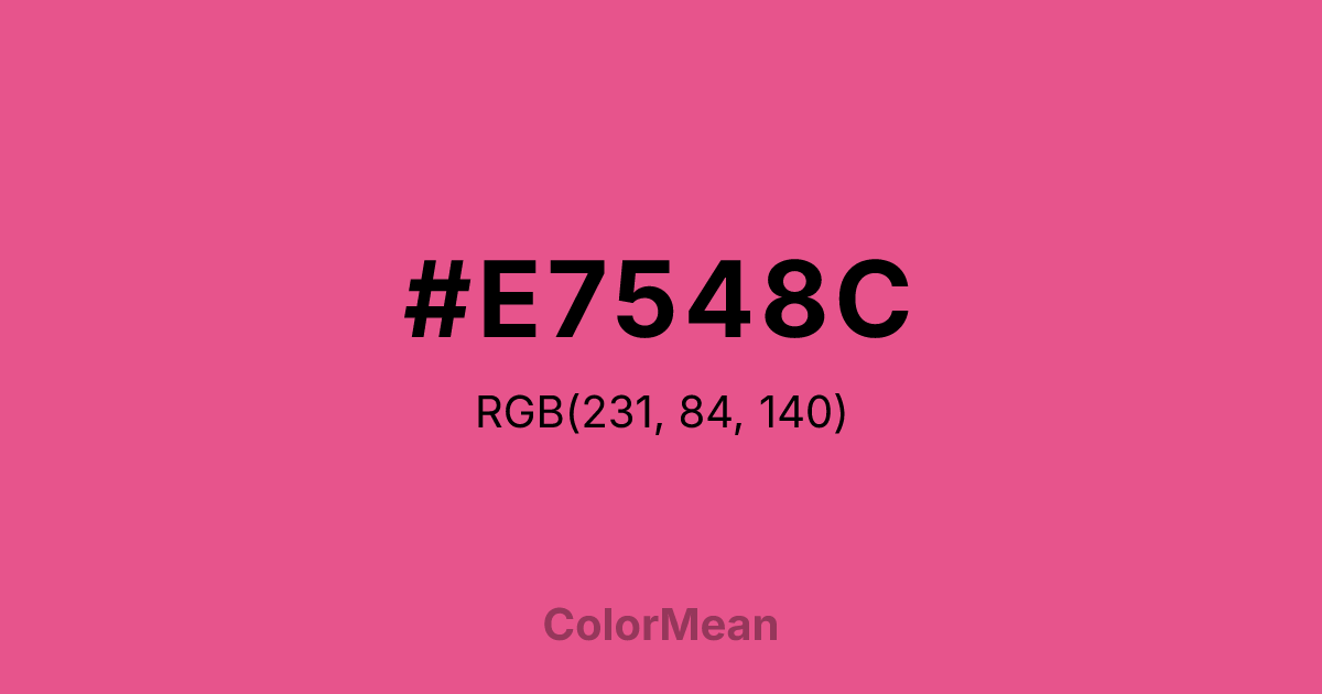 #E7548C RGB value is (231, 84, 140). The hex color red value is 231, green is 84, and blue is 140. Its HSL format shows a hue of 337°, saturation of 75 percent, and lightness of 62 percent. The CMYK process values are 0 percent, 64 percent, 39 percent, 9 percent.