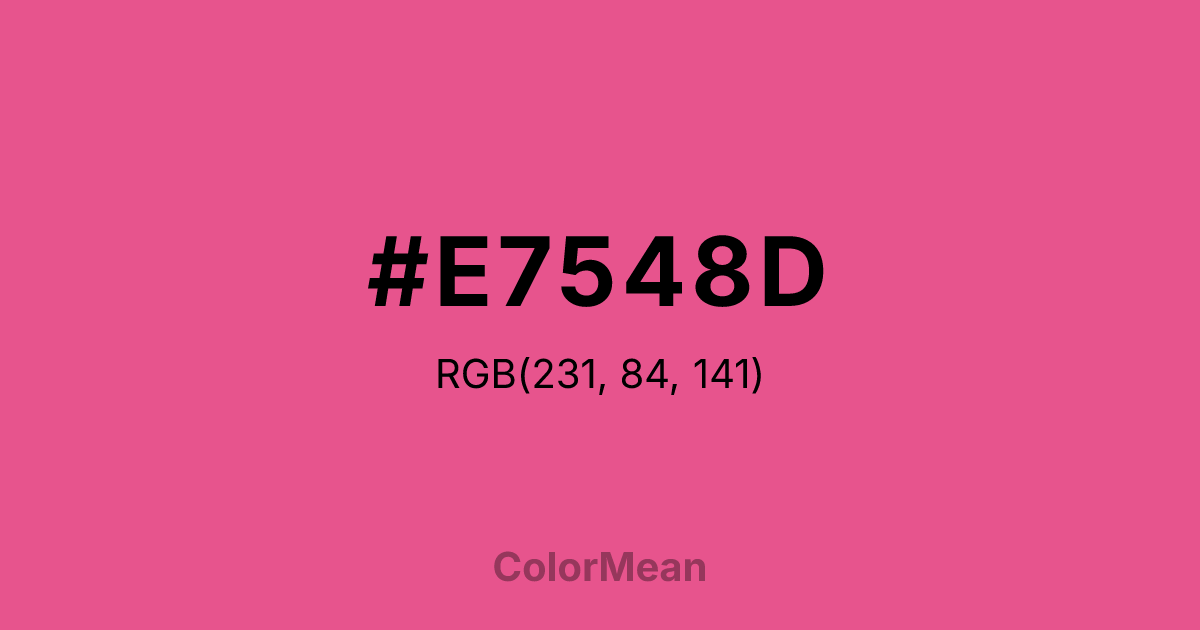 #E7548D RGB value is (231, 84, 141). The hex color red value is 231, green is 84, and blue is 141. Its HSL format shows a hue of 337°, saturation of 75 percent, and lightness of 62 percent. The CMYK process values are 0 percent, 64 percent, 39 percent, 9 percent.