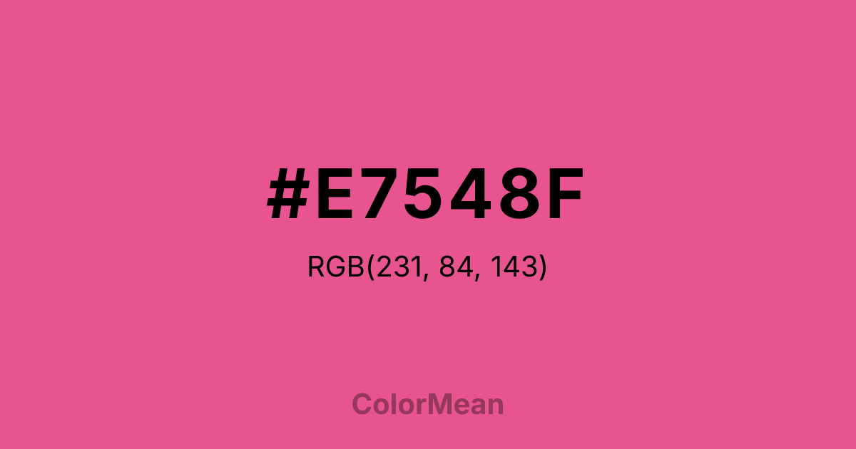 #E7548F RGB value is (231, 84, 143). The hex color red value is 231, green is 84, and blue is 143. Its HSL format shows a hue of 336°, saturation of 75 percent, and lightness of 62 percent. The CMYK process values are 0 percent, 64 percent, 38 percent, 9 percent.