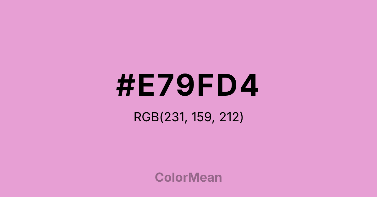 #E79FD4 RGB value is (231, 159, 212). The hex color red value is 231, green is 159, and blue is 212. Its HSL format shows a hue of 316°, saturation of 60 percent, and lightness of 76 percent. The CMYK process values are 0 percent, 31 percent, 8 percent, 9 percent.