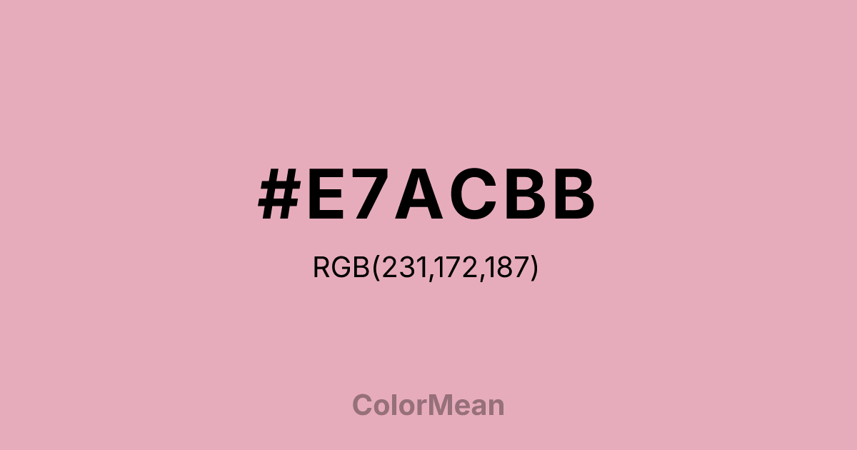 #E7ACBB RGB value is (231, 172, 187). The hex color red value is 231, green is 172, and blue is 187. Its HSL format shows a hue of 345°, saturation of 55 percent, and lightness of 79 percent. The CMYK process values are 0 percent, 26 percent, 19 percent, 9 percent.